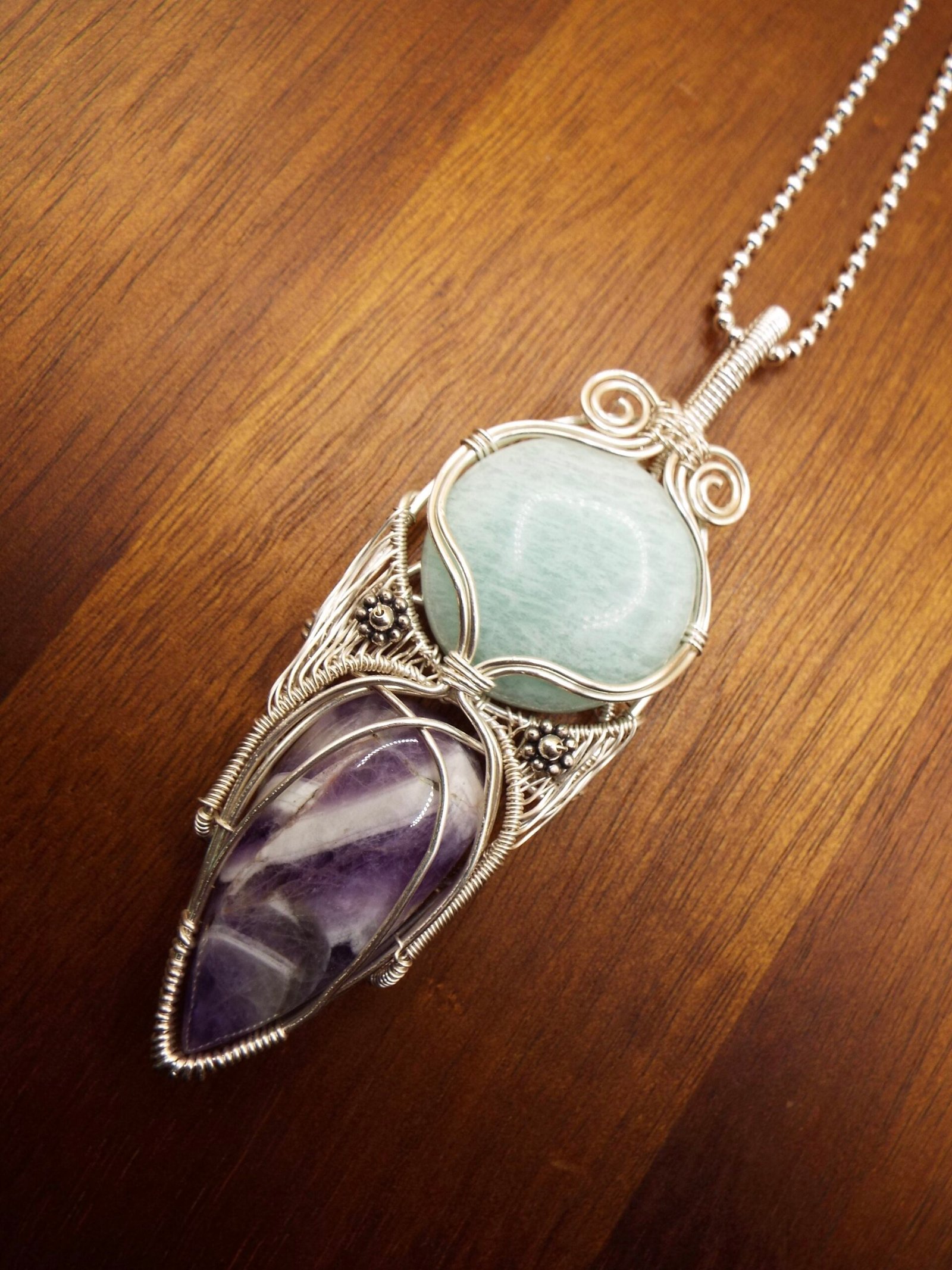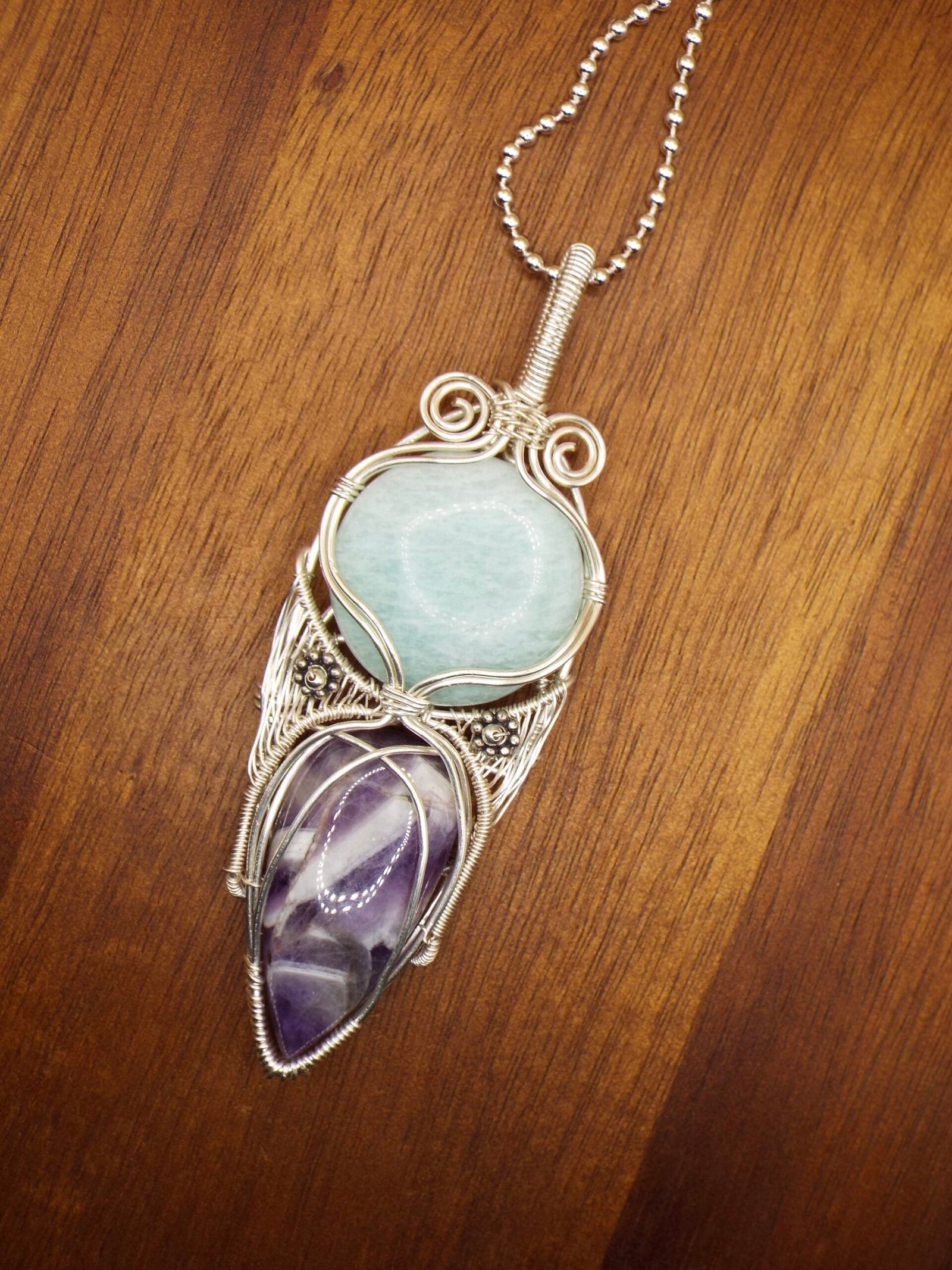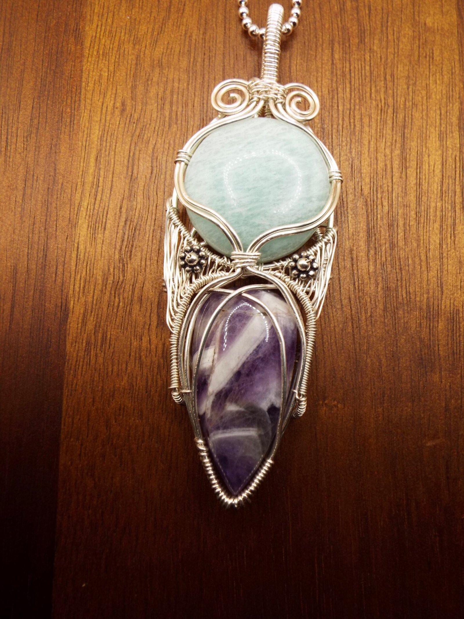 An Amazonite crystal stone combined with a Chevron Amethyst crystal stone in a unique wire wrap in Silver Fill Wire. it comes on a 20 inch silver plated chain.