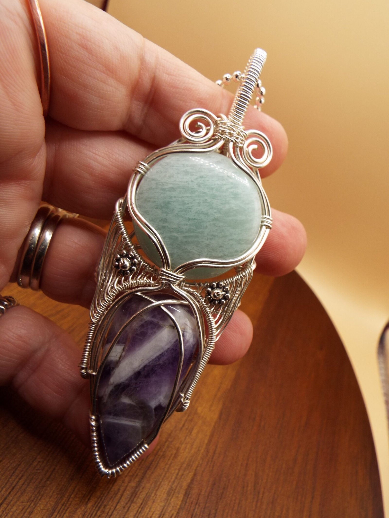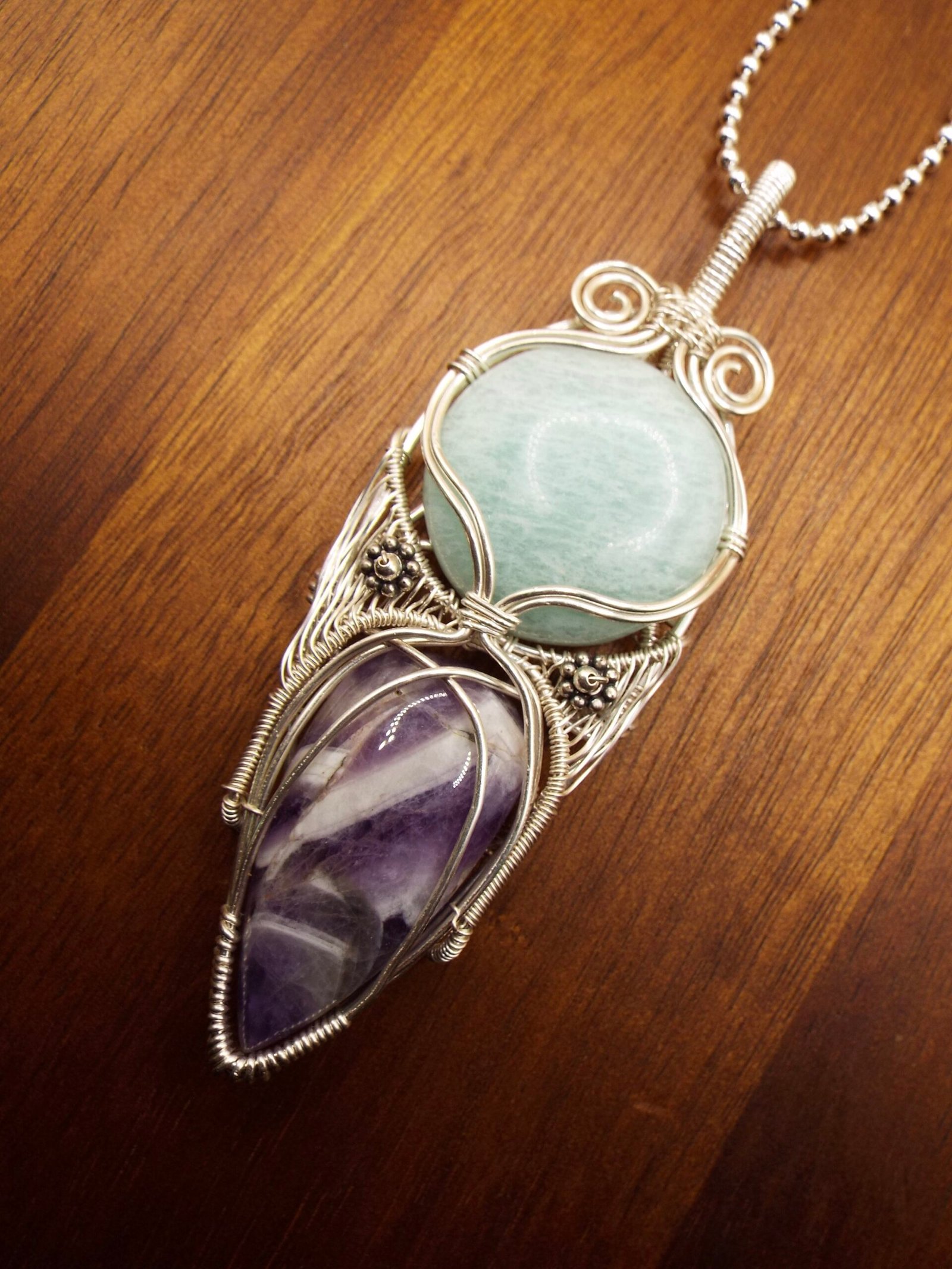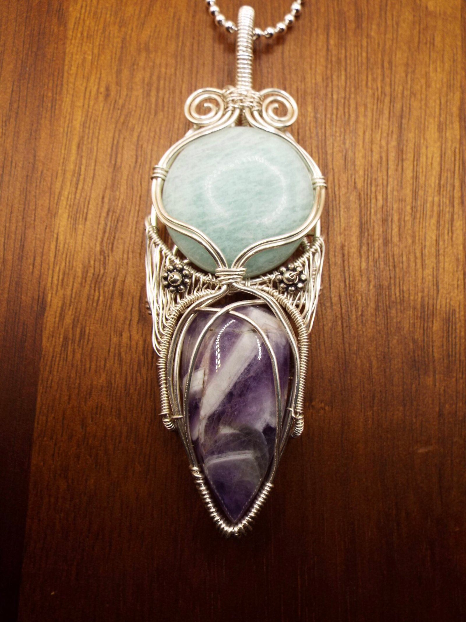An Amazonite crystal stone combined with a Chevron Amethyst crystal stone in a unique wire wrap in Silver Fill Wire. it comes on a 20 inch silver plated chain.