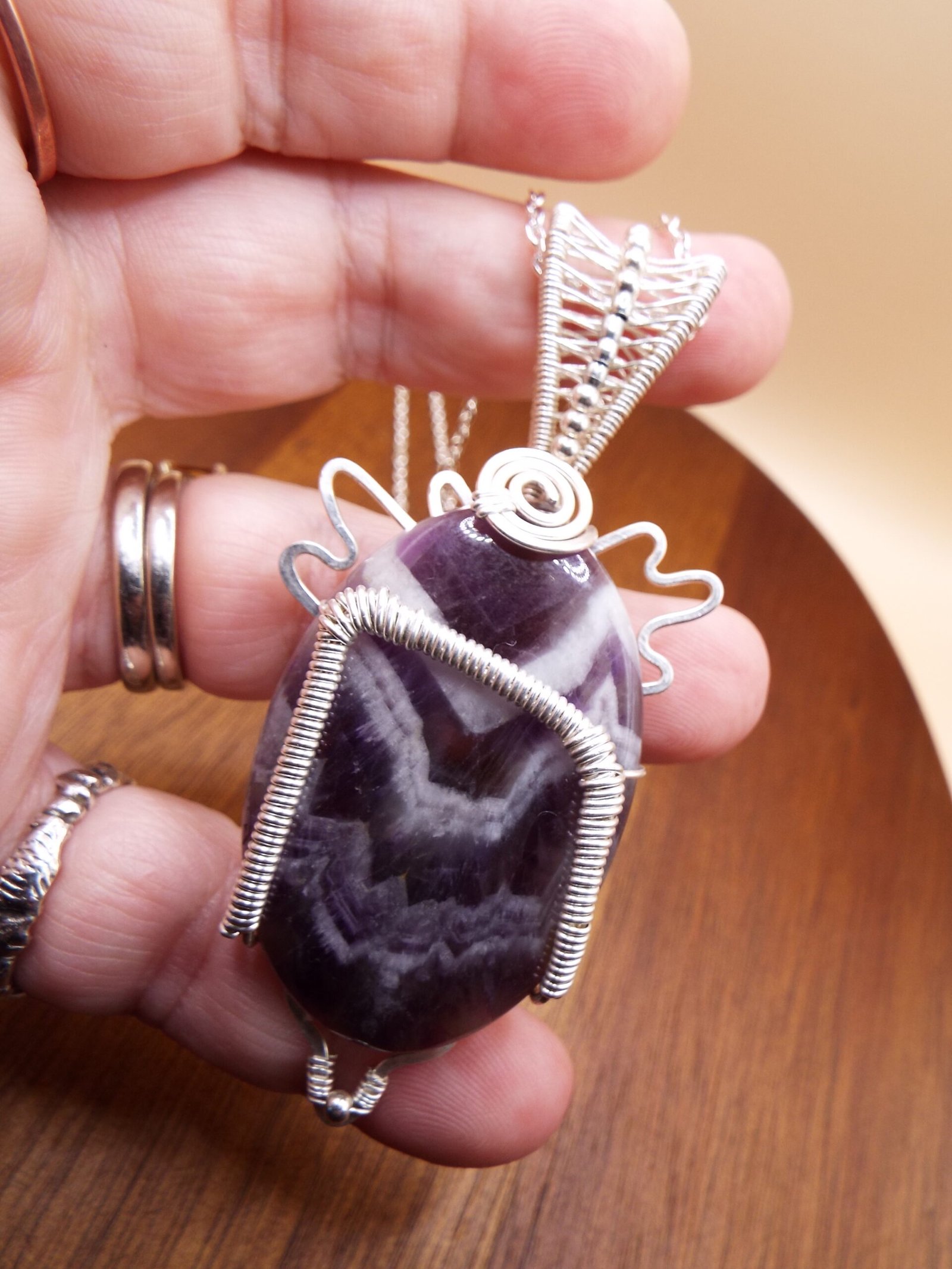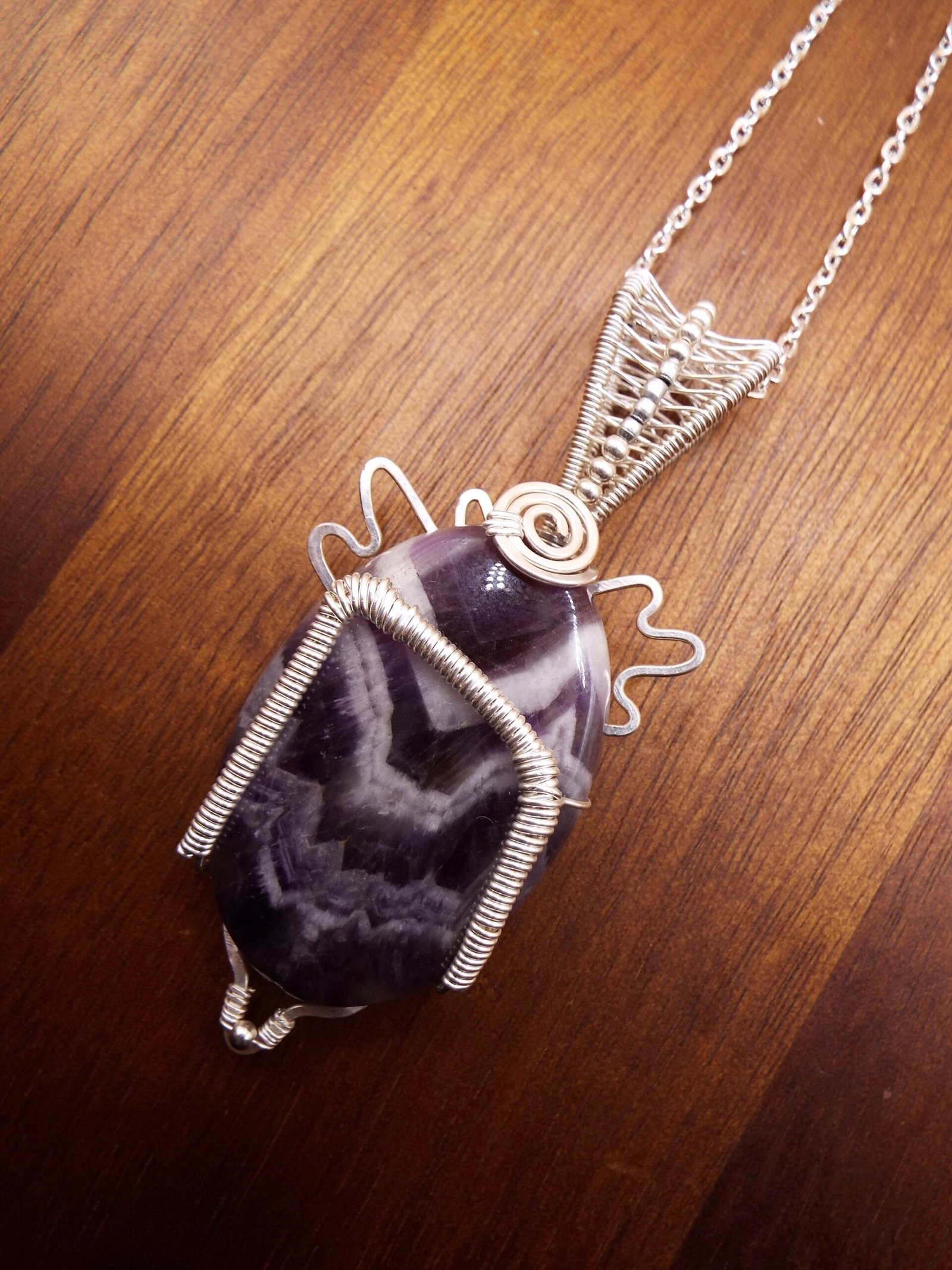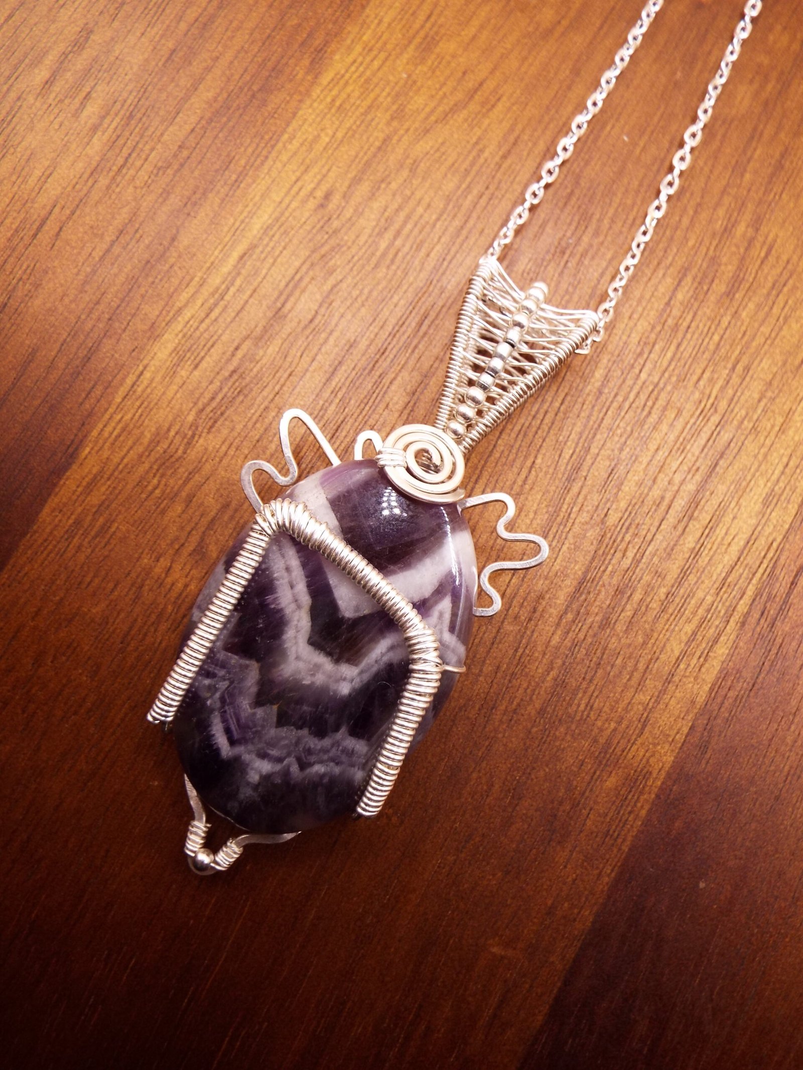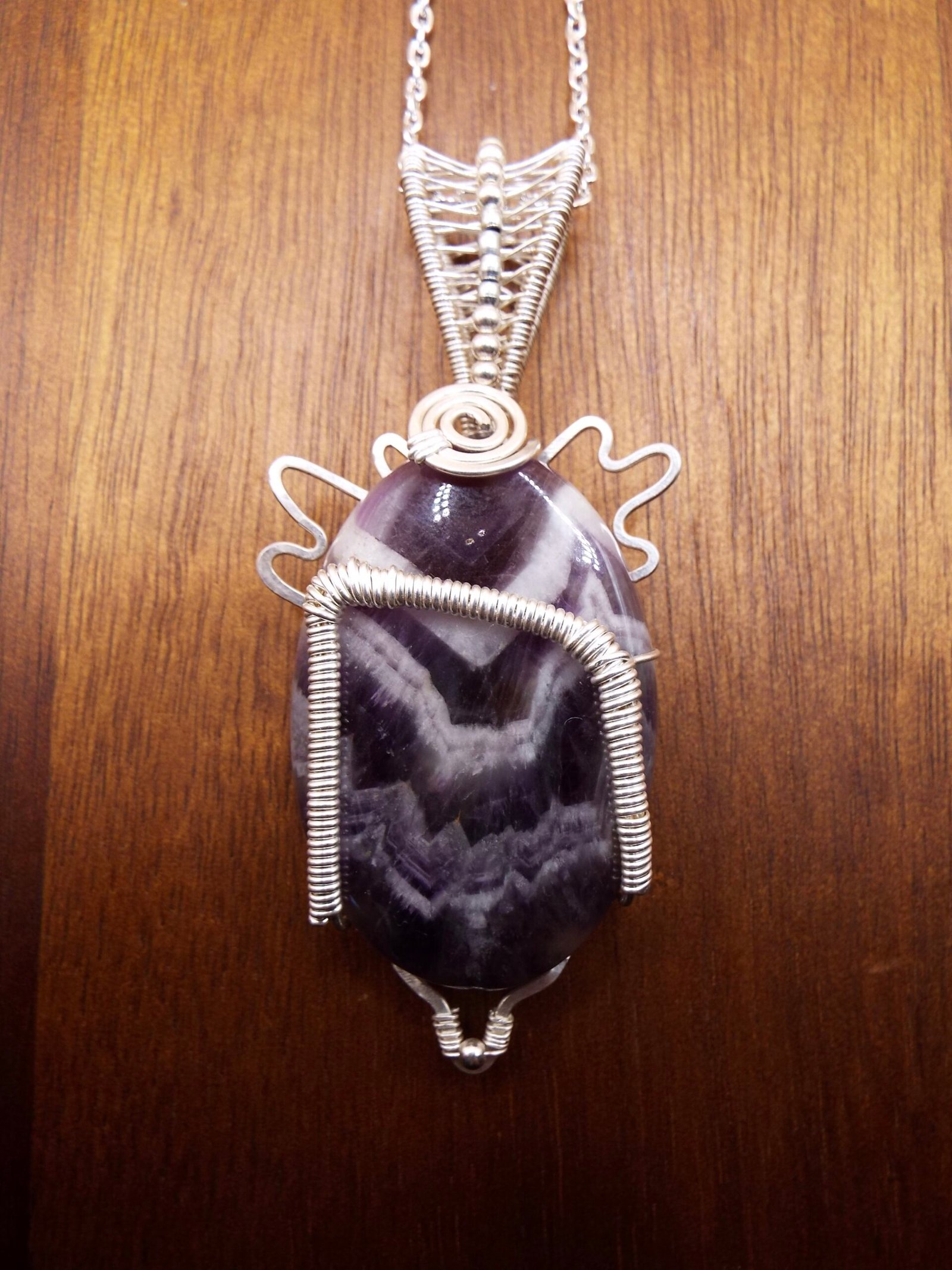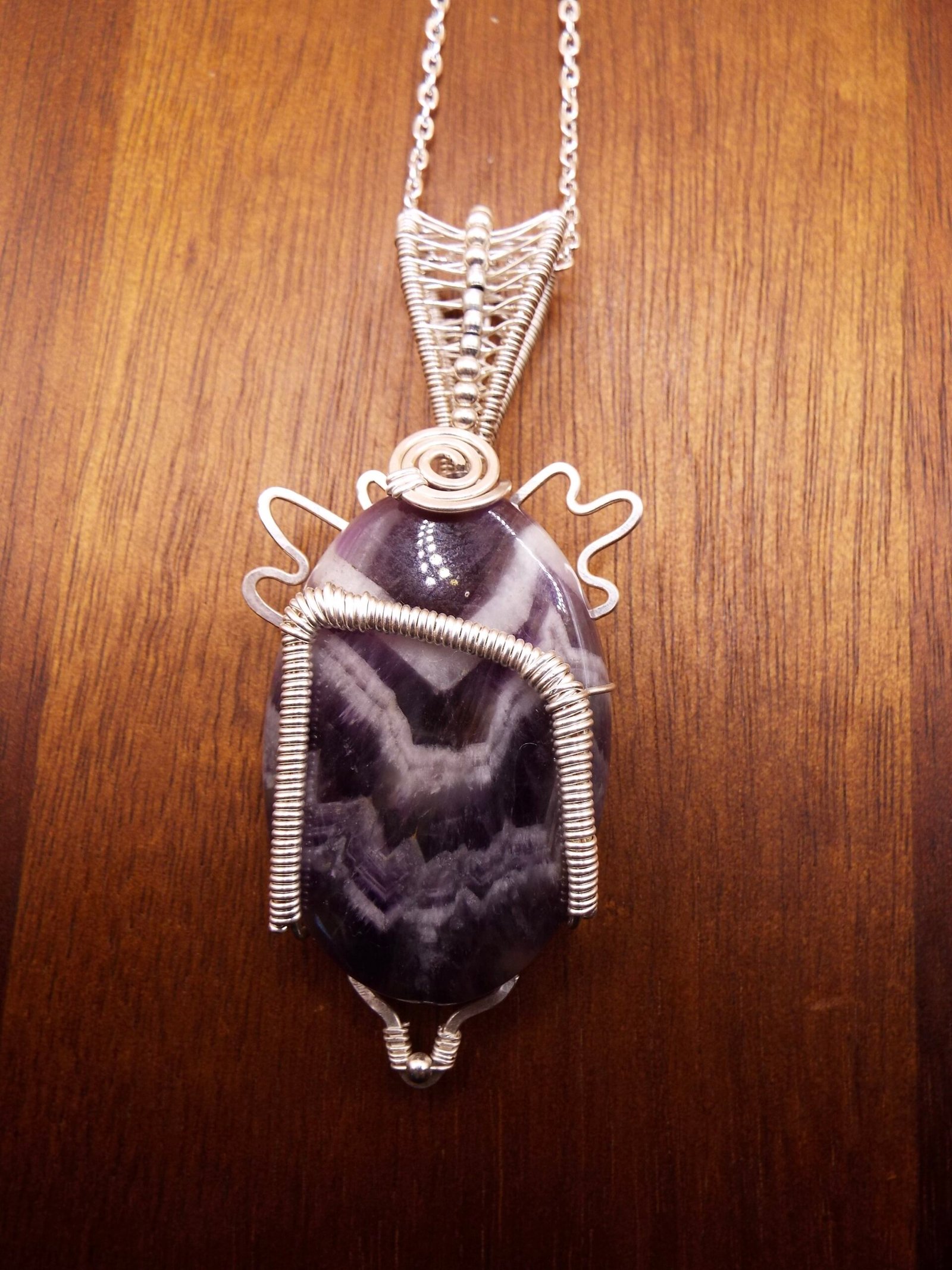 This Chevron Amethyst crystal stone is wrapped in Silver Fill wire in a one of a kind design featuring the Rune symbol ” Uruz ‘. Uruz attributes are Strength, Courage, Healing, and Revitalization. This Pendant Necklace comes on a 20 inch matching chain.