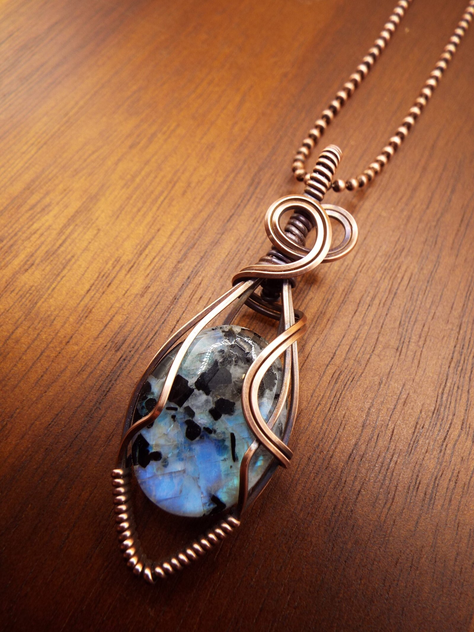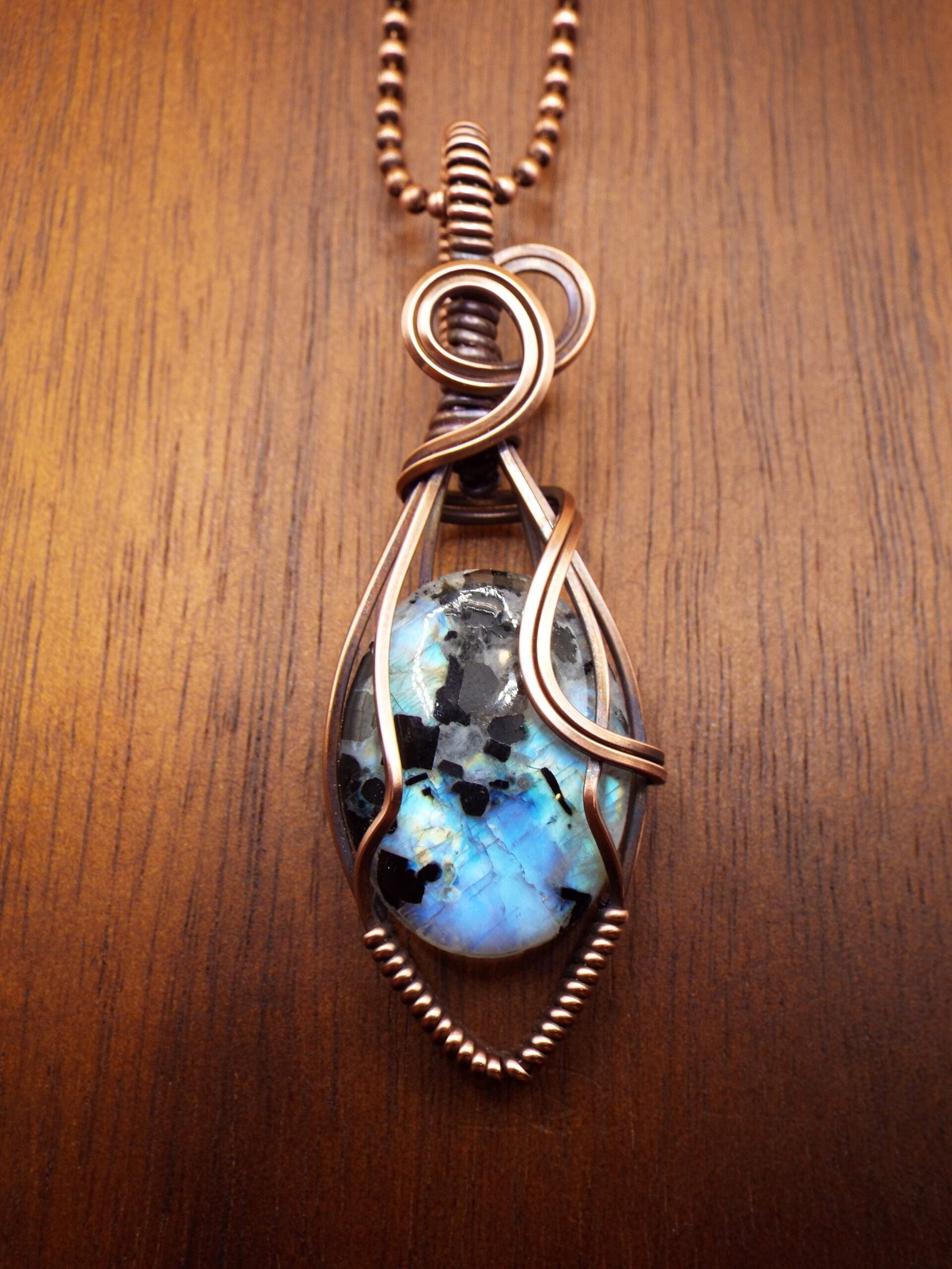 A flashy Rainbow Moonstone crystal stone wrapped in antiqued copper wire. It comes on a matching 20 inch chain.
